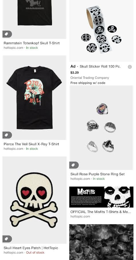 When I visited the store Hot Topic in the mall, I noticed skulls were everywhere.
